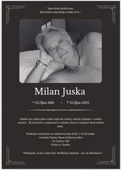 Smuteční hostina dle přání našeho kamaráda Milana se uskuteční po skončení obřadu U Čtyř Bernardýnů.